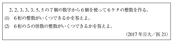 [B]7つの数から6桁の数を作る問題(2017年日大/医21)