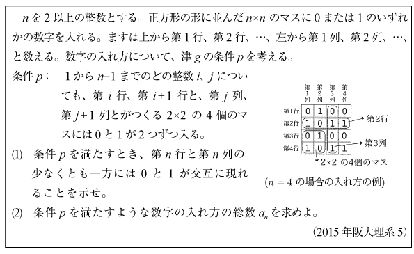 [C]0か1を同数並べる並べ方の数の問題(2015年阪大理系5)