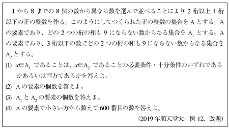 [B]8個の数から作る正の整数の個数の問題(2019年順天堂大/医12)