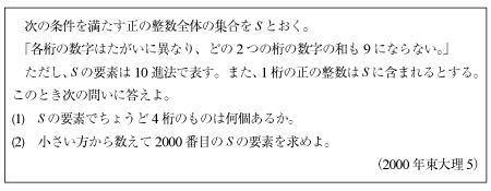 [D]どの2つの桁の数字の和も9にならない4桁の自然数の問題(2000年東大理科5)