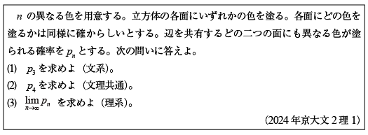 [C]n色で立方体表面を塗りつぶす確率の問題(2024年京大文2理1)