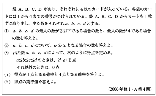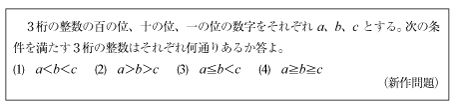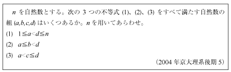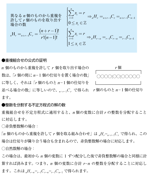 合計がnとなるr個の整数・自然数の不定方程式の解の数は次の式に従います。 [例題][B]各桁の数字が1組の不等式を満たす整数の数の問題(新作問題)[C]4×4のカードの問題(2006年数Ⅰ・A第4問)[C]自然数・整数の数の問題(2006年東京医科歯科大1)[C]自然数・整数の数の問題(2004年京大理系後期5)