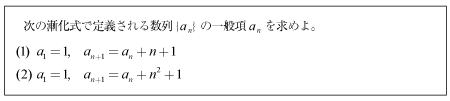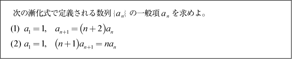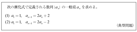 本項ではまず、パターンを取得するために、できるだけやさしい問題から紹介します。漸化式は国立大では単独ではなく確率などの融合問題として出題される場合が多く、その場合には「漸化式を作る」ところから始まります。したがってこの分野はかならず「得意分野」にしておかなければなりません。パターンは随時改善していきます。