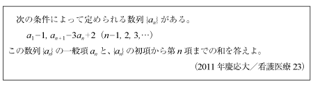 [A]2項間特性方程式型漸化式の問題(2011年慶応大/看護医療23)