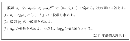[B]対数型漸化式の問題(2011年静岡大理系1)