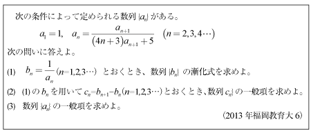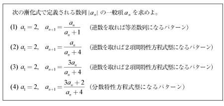 分数型漸化式は逆数型漸化式の一般化された形であり、特に面倒ですが、一般的には誘導が用意されます。初めて見たときや誘導がないときのためには、あらかじめ慣れておくべきでしょう。分数型漸化式の一般的な解法はこちらに紹介しておきます。