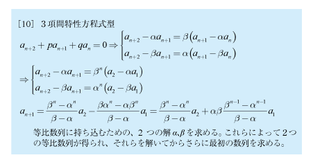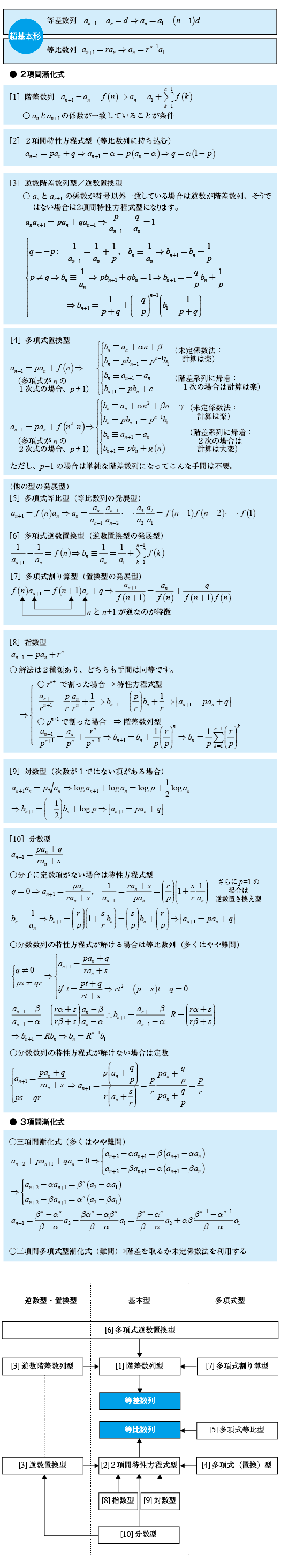 漸化式には、明らかな等差数列・等比数列と特殊な連立漸化式・数学的帰納法などのパターンを除くと、主要なパターンは下記の10種にまとめられます。