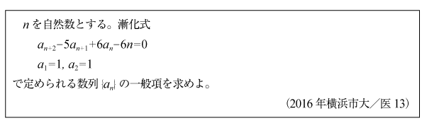 整数nを含む漸化式を、本項では「多項式型」と称します。多くは2項間漸化式ですが、2016年には三項間の多項式型漸化式の難問が横浜市大で出題されました。本頁最下段で紹介します。