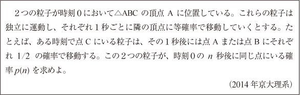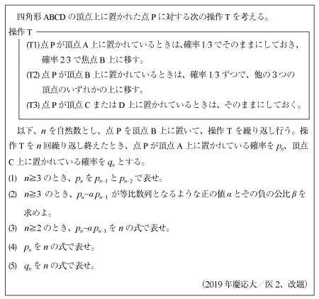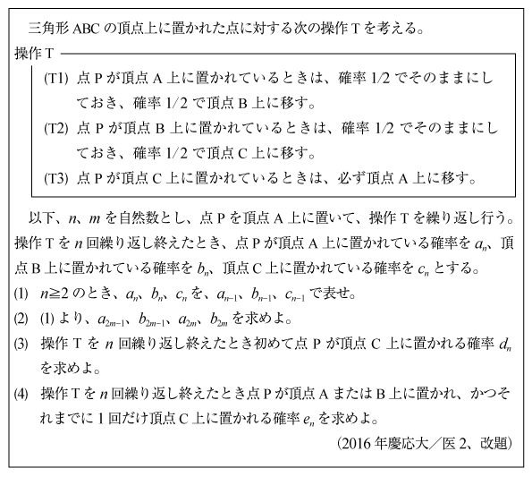 [C]連立漸化式を作って解く三角形の頂点上の移動の問題(2016年慶応大/医2)