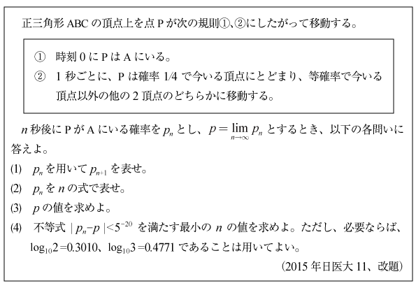 確率漸化式の問題は、確率漸化式の数が多くなると難しくなります。最初は直線上の移動の問題など、漸化式1つの問題をマスターし、次に2つ以上の問題に進むとよいでしょう。それも、三角形の頂点の移動の問題では最初は複数の漸化式が必要で、すぐに1つの漸化式に帰着させるので、次の順番でマスターするのが適当でしょう。