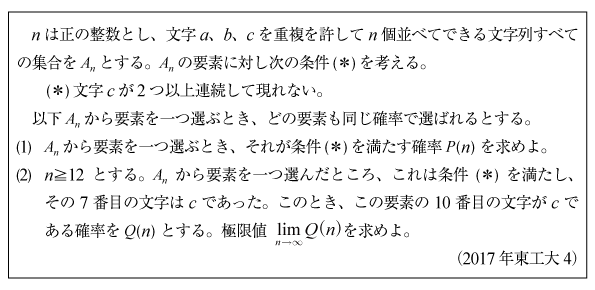 [C]単独漸化式を作って解く文字ならべの問題(2017年東工大4)