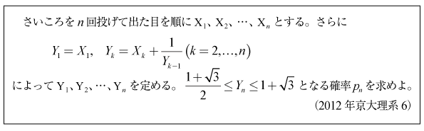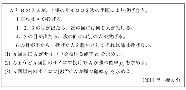 [D]確率漸化式を作って解くサイコロの目に関する問題(2012年京大理系6)