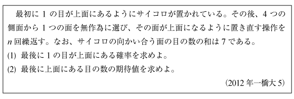 [C]さいころの上面の目の期待値の連立漸化式の問題(2012年一橋大5)