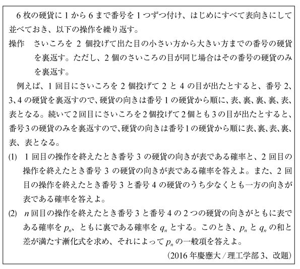 [D]連立漸化式を作って解くコインの裏表の問題(2016年慶応理工3)