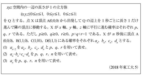 [D]4つの連立漸化式が必要な空間内移動の問題 (2018年東工大5)