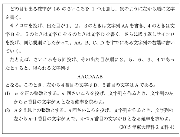 [D]連立漸化式を作って解く文字ならべの問題(2015年東大文4理2)