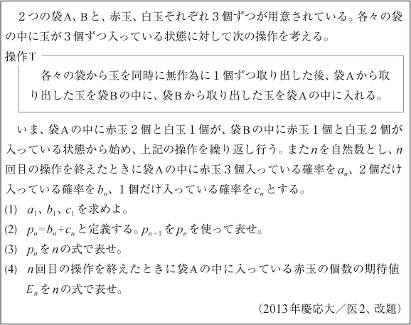 [C]4つの連立漸化式を作って解く赤球の個数の問題(2013年慶応大/医2)