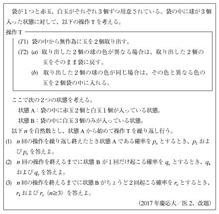 [C]単独漸化式を作って解く球数の問題(2017年慶應大/医2)
