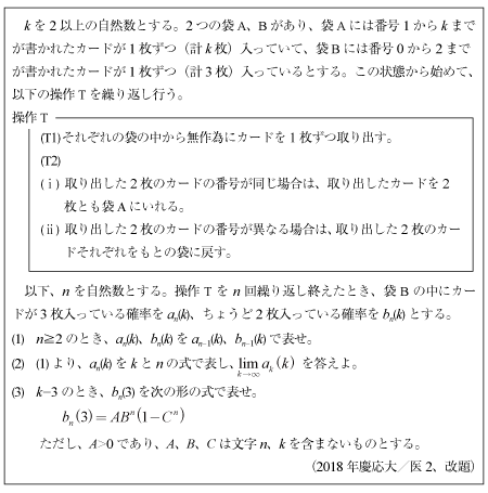 [C]2つの袋に入っているカードの枚数の確率の問題(2018年慶大/医2)