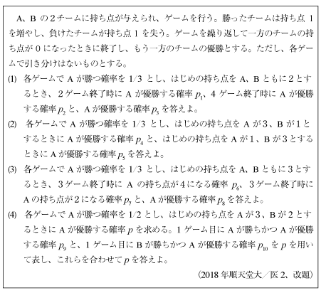 [C]確率漸化式で解く破産の確率の問題(2018年順天堂/医2)