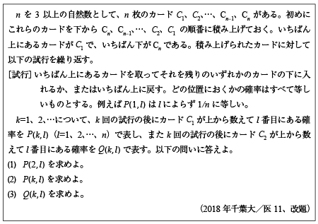 [D]積み上げたカードの並べ替えの確率漸化式の問題(2018年千葉大/医11)