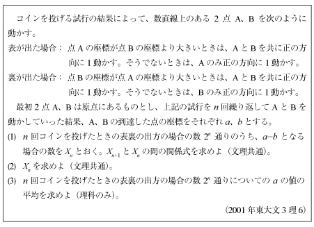[C]数直線上の移動の確率に関する漸化式の問題(2001年東大文3理6)