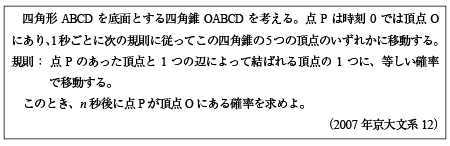 [B]四角錐の頂点上の移動を確率漸化式で解く問題(2007年京大文系12)