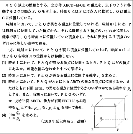 [C]立方体の頂点を移動する2つの点の確率の問題(2010年阪大理系5)