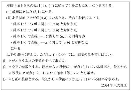 [C]座標上の対称移動に関する確率漸化式の問題(2024年東大理3)