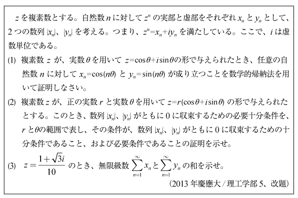 [B]複素数の数列の極限の問題(2013年慶應大/理工5)