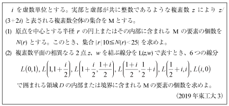 [D]複素平面内の回転した領域に含まれる格子点の数の問題(2019年東工大3