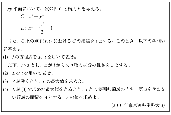 [C]円の接線が楕円を切る問題(2010年東京医歯大3)