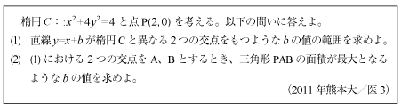 [B]楕円上に頂点を持つ三角形の面積の問題(2011年熊本大/医3)