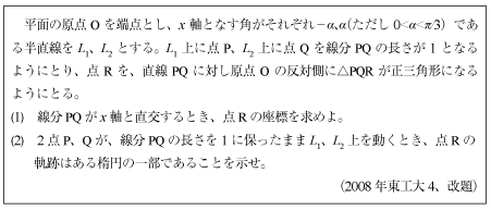 [C] 2直線上に頂点をおく正三角形の頂点が楕円を描く問題(2008年東工大4)