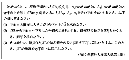 [C]空間問題における平面上の軌跡の問題(2019年筑波大推薦/医4)