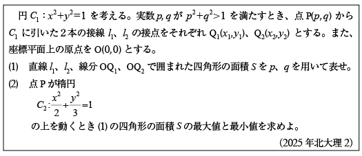 [B]円外の2本の接線と半径が囲む領域の面積の問題(2025年北大理2)