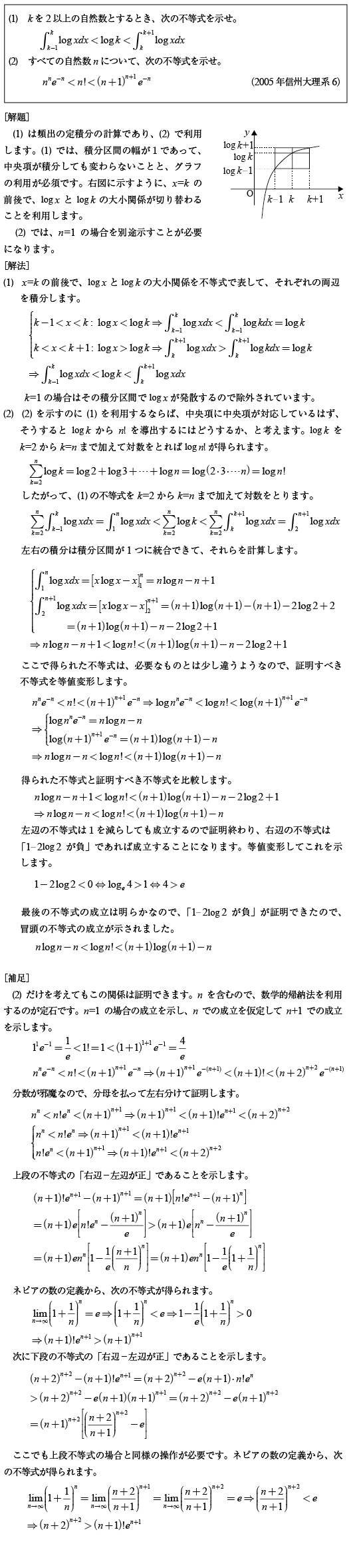 [C]階乗をネピアの数のべきで評価する問題(2005年信州大/理6)