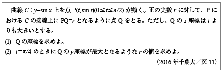 [B]正弦関数の接線上の点のy座標の最大値の問題(2016年千葉大/医11)