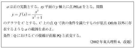 [B]関数の接線が定点と結んだ直線に直交する条件の問題(2002年東大理科4)