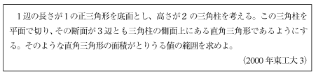 [C]正三角柱の内部の直角三角形の面積の問題(2000年東工大3)