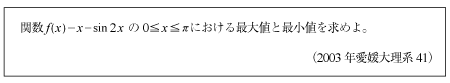 [A]数Ⅲ関数の最大値と最小値を求めるやさしい問題(2003年愛媛大理系41)