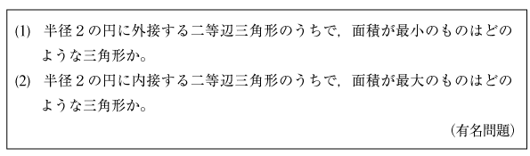 [B]内外接二等辺三角形の面積の最大値・最小値の問題(有名問題)