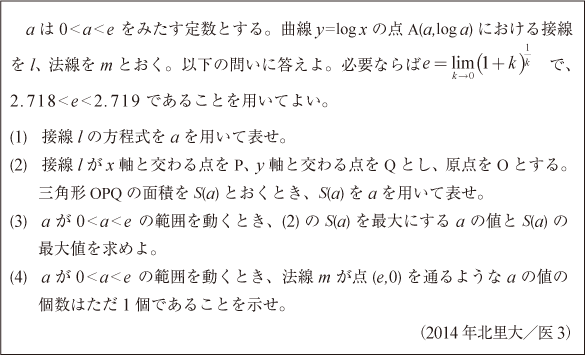 [C]対数曲線の接線・法線の問題(2014年北里大/医3)