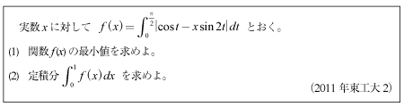 [D]絶対値記号付き積分の最小値と定積分の問題(2011年東工大2)