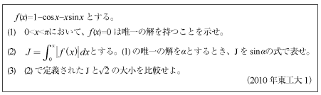 [C]方程式の唯一解と絶対値記号付き積分の問題(2010年東工大1)
