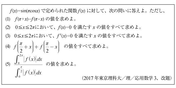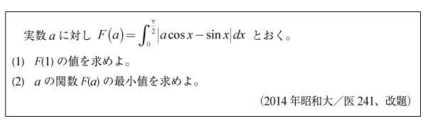[B]絶対値記号付三角関数の積分の最小値を求める問題(2014年昭和大/医241)