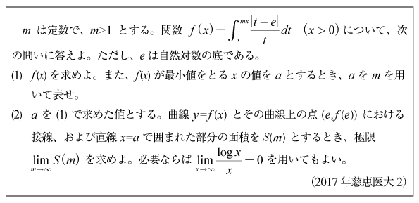 [D]絶対値記号付積分の極限の問題(2017年慈恵医大2)