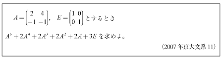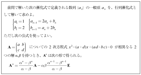 - 最初の数例を実際に計算してn乗を予想し,数学的帰納法を利用する。