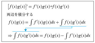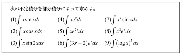 関数の積の微分と部分積分は裏表の関係にあります。べき乗と三角関数・指数関数・対数関数の組合せの積分や、三角関数と指数関数の積など「異種関数の積」の積分には部分積分を利用します。三角関数の積分をご参照ください。