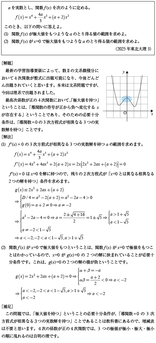 [B]4次関数の極大値がある条件の問題(2025年東北大理3)
